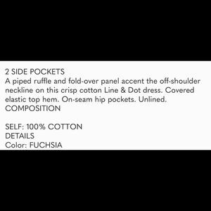 A piped ruffle and fold-over panel accent the off-shoulder neckline on this crisp cotton Line & Dot dress. Covered elastic top hem. On-seam hip pockets. Unlined. Fabric: Shirting. 100% cotton. Hand wash. Imported, China.