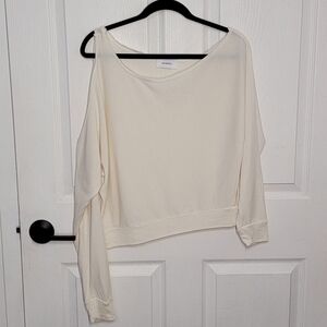 Stylish cream off-shoulder top. Perfect for casual wear. Raw cut neckline and shoulder cut-out. Terry cloth lining. Long sleeve. Loose fitting. Color cream. Cut out shoulder.