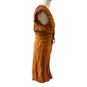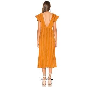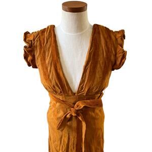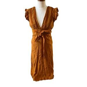 Revolve Line & Dot Bryn deep plunge dress in Carmel, size S. Good preowned condition with the only flaw to note the beginning of separation of the fabric near the bottom of zipper, see photo