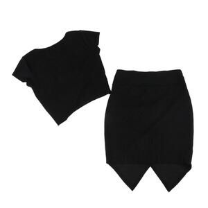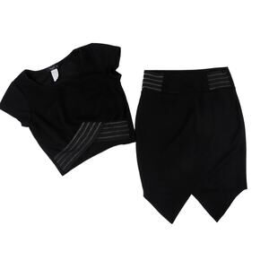 Revolve Love J Two Piece Skirt Set. Sexy 2 Piece Dress or Black Skirt Set. Short Sleeve, Cap Sleeve Scoop Neck Crop Top with Sheer Overlapping Panels and Wrap Front Look. High Rise Body Con Midi Skirt with Front Slit. Sheer Panels on Waist. Stretchy, Flattering Fit