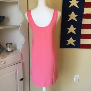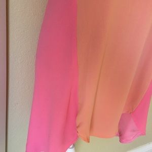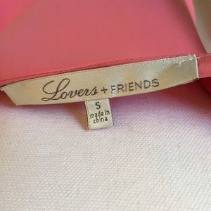 Revolve brand, Lovers + Friends, summer dress in a pink and peach two-tone color. Scoop-neck in the front and back. High-lo hemline. Lightweight material. 100% polyester. Tag marked a size S. shoulder to hemline (front) measures at 34". Underarm to underarm measures at 17.5".
