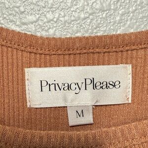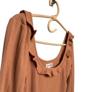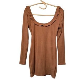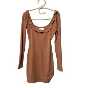 Flirty and flattering ribbed mini dress by Privacy Please in a warm tan hue. Features a soft bodycon fit, scoop neckline, and subtle ruffle trim for a feminine touch. Long sleeves make it versatile for layering across seasons.
