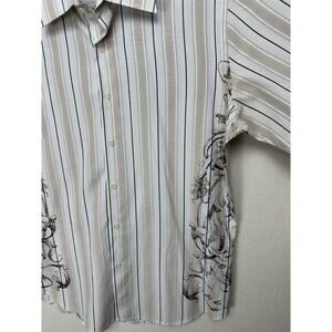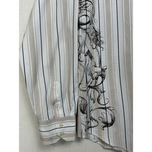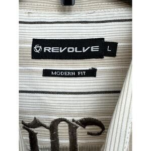 The Revolve Men's Tan striped Embellished Button Shirt in size Large is a stylish and versatile piece for any man's wardrobe. Featuring an embroidered design and a spread collar, this lightweight shirt is perfect for various occasions including casual outings, parties, and even travel. Made from a blend of polyester and cotton, this woven shirt is comfortable to wear in all seasons and adds a touch of designer flair to your look.