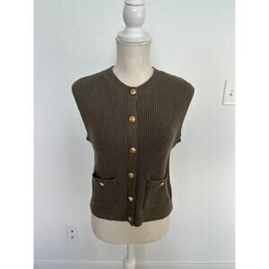 This vest is perfect for the minimalist. It is by Aimee Song, and it is an olive green knit sweater vest. It is accented by gold buttons down the front. It is perfect for a chic, quiet luxury look. It is a medium knit, perfect for layering. There is one very small string pull please see photos. New without tags.