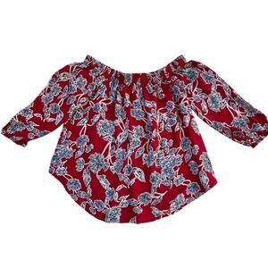 Splendid off-shoulder red and blue floral blouse featuring a lightweight, flowy design with 3/4 sleeves. Perfect for warm weather and casual outings, this top offers a relaxed, boho-inspired look.