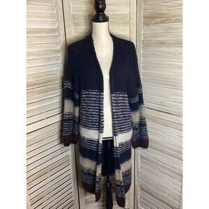 Open front cardigan in a mixed colors stripe mostly blues and burgundy with a little silver metallic
