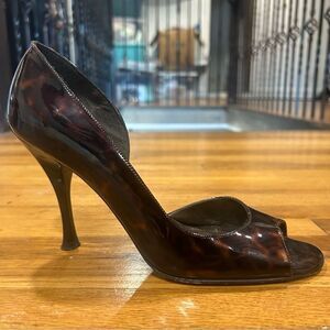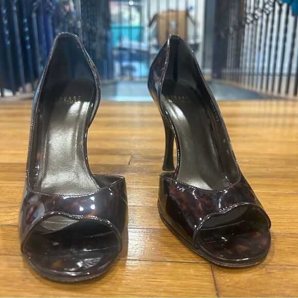 Stuart Weitzman d'orsay tortoise peep toe sculpted heel patent leather pumps
