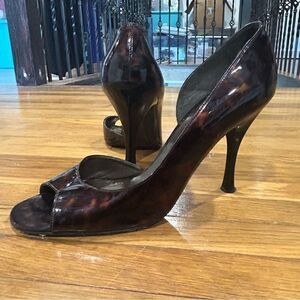 Stuart Weitzman d'orsay tortoise peep toe sculpted heel patent leather pumps