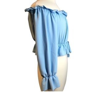 Really pretty off the shoulder powder blue cropped ruffle blouse.