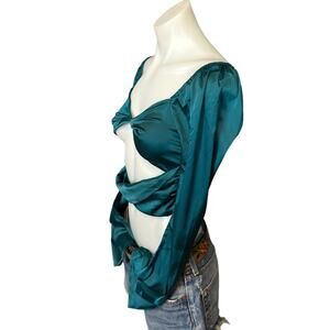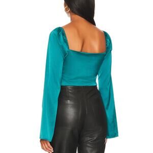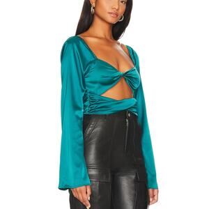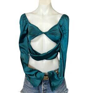 Revolve Teal Satin Crop Top SMALL Going Out Long Sleeve More to Come Cyntia NEW