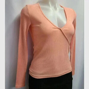 Revolve The Fifth Label Peony Pink Ribbed Knit Stretch Top 90s Y2K style size Small. New with tags. Ribbed knit long-sleeved top. Pale pink. Slim fit with stretch. V-neck. Faux surplice front. No fabric content tag but looks and feels like cotton spandex blend. Soft and lightweight. In excellent condition, new with tags. Revolve brand. New with 90s and Y2K inspired style, Barbiecore ribbed knit.