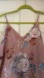 Beautiful floral dress measures 18 inches pit to pit; 55 inches in length. Dress just slips on has lining up to the knee then is sheer. Has a front slit. Background color is a pink mauve.