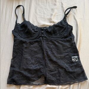 Elegant black lace camisole with delicate straps. Perfect for layering or wearing alone. By More to Come