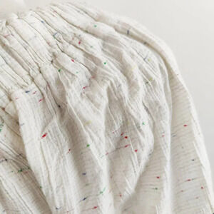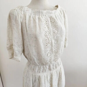 Wear off the shoulders or on. Pretty mini dress with lots of details. Elastic waist. Embroidered eyelet highlights from neck to hemline. Fabric does not stretch, but the shoulders and waist does provide some elasticity. Fabric is an off white with speckles of color.