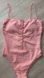 This one-piece swimsuit features a textured scalloped fabric in a pink/coral hue. Partial front button, square neck, and spaghetti shoulder straps.