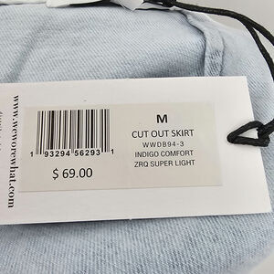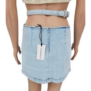 Revolve Weworewhat woman's size Medium cut out denim jean skirt indigo comfort super light wash adjustable buckled waist belt waist cutout zipper closure at hips and back NEW with tags