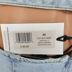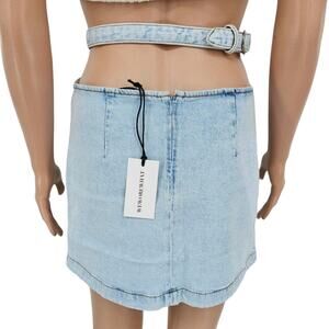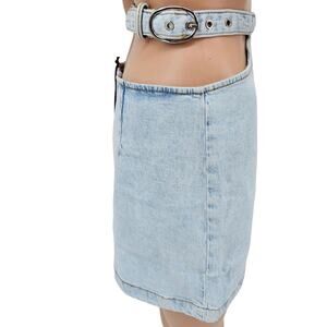 Revolve Weworewhat woman's size Extra Small cut out skirt indigo comfort super light denim jean skirt light wash no distressing adjustable buckled waist belt waist cutout at hips and back zipper closure NEW with tags