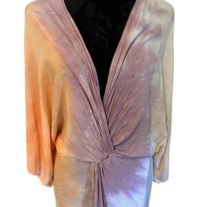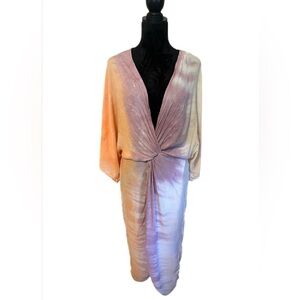 Elegant tie-dye midi dress. Features a deep V-neck and knotted front. Flowy sleeves and hem. Perfect for summer vacations or a beach wedding.