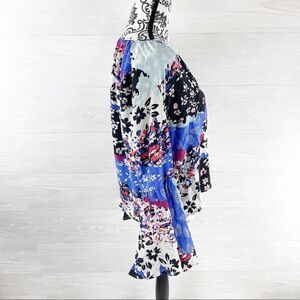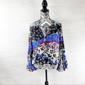 Revolve Yumi Kim Wanderlust top size medium. Multicolor and multiprint silk material with tie notched crewneck collar. Bell sleeves. No holes or stains. Boho staple piece with lightweight material!
