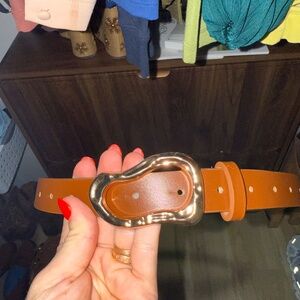 Never worn brown belt with gold buckle from Revolve. OS measures approx 29" - 39" L x 1" H