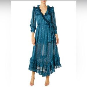 Revolve dress Misa Los Angeles Teal Blue Gown Gold Reflects & Ruffles XS NWT