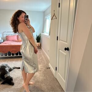 I adore this super pretty designer Revolve h:ours silver metallic sleeveless knee length mini dress