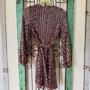 Bardot's Australian designer Carol Skoufis wanted to create glamorous styles with a wink toward sexy. She nailed it with this stripe sequin mini dress In multi layer pink. Electric energy igniting with dramatic impact when stepping into the light. This statement style fuses sequins and a contemporary stripe pattern with the simplicity of a wrap-dress silhouette.Featuring long balloon sleeves, a V neckline, a wrap-tie waist, and finished in a mini-skirt hemline. Ideal for evening soirees where the dress code is effortless chic, or for adding a little extra spark to date night.MSRP $158