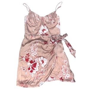 Revolve x Camila Coelho Martina Satin Blush Pink Floral Wrap Tie Bustier Dress -Surplice front with tie accent -Matte satin fabric with unpadded underwire cups -Fully lined -Hidden side zipper closure -Self: 55% viscose, 45% rayon -Lining: 100% rayon