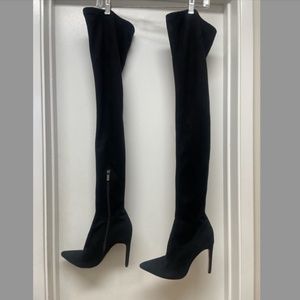 Unapologetically chic, the Chrissy Teigen by RAYE Como Boot is up for anything the night brings. This thigh-high style fits snugly around the legs, elongating the frame with a pointed toe and a stiletto heel.. Faux suede upper with leather lining and leather sole. Side zip closure.