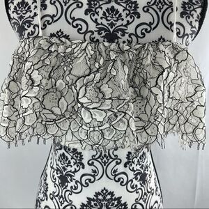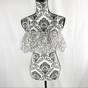 New with tags Revolve NBD Marissa crop top size x-small. White and black floral lace with frayed lace trim. Adjustable shoulder straps and floral fabric overlay detail. Hidden back zipper closure and fully lined. Cotton,nylon/polyester shell with cotton/spandex lining blend material with some stretch .