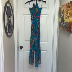 Revolve Parker Megara Combo Jumpsuit in Azule Sardinia, size 0. Excellent used condition! 100% silk. Absolutely gorgeous! Slits in both legs. Halter style.