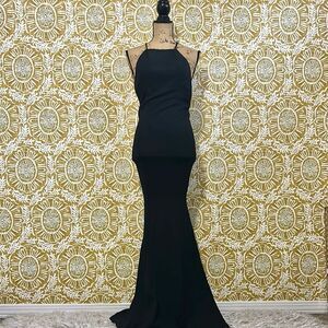 This stunning black maxi dress features a flattering sheath silhouette with a halter neckline that elegantly frames the shoulders. Its full-length style ensures a dramatic and graceful look for any special occasion.