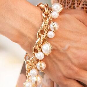 Classic white pearls and solitaire pearls that are threaded along a rod inside imperfect gold rings swing from a chunky section of double-linked gold chain, creating a dramatic display across the chest.
