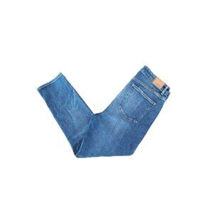 Medium rinse stonewashed skinny ankle jeans. High-waisted. Single button and zipper front closure. Distressed detail on the hem and pocket trim. Whiskering accents. Sanded detail. Five pockets.