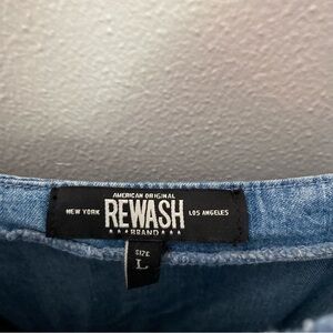 Light blue denim piece by Rewash. Casual and versatile style. Side zipper and waist tie. Back pockets. In good condition
