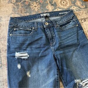 These Rewash skinny jeans in a classic blue hue feature stylish distressing with prominent rips at the knees, offering a modern and casual look. The medium-dark wash and subtle fading add depth and dimension to the denim, making them a versatile addition to any wardrobe.