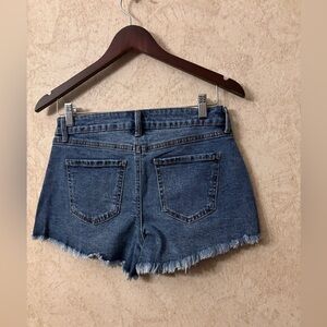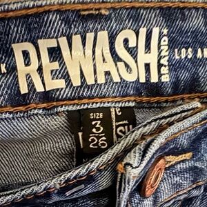 Trendy Rewash jean shorts. Classic blue hue. Frayed hem for a casual vibe.