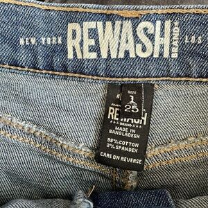 Crafted by Rewash, these blue jean shorts boast a distressed design with intentional rips and frayed edges, offering a casual and rugged appeal. The medium-to-dark wash enhances the shorts' character, while the raw-edged hem sits comfortably at mid-thigh for a laid-back style.