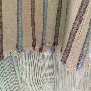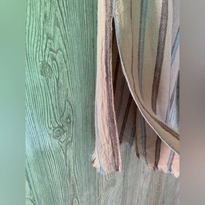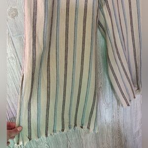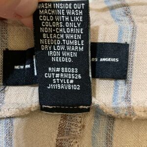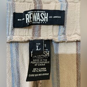 Great condition Rewash Linen Paper Bag Waist Wide Leg, Raw Edge Split Hem Pants. Great striped pattern in blue and brown. Elastic back waistband with tie belt. Easy pull on. 4 pocket design. Great for the beach, lounging, or casual workwear. SZ Large