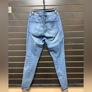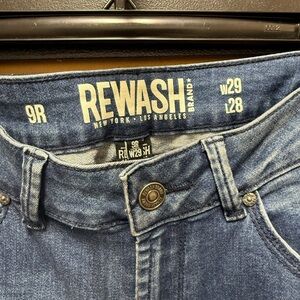 Add some edge to your denim collection with these Rewash skinny jeans featuring a trendy snake print stripe down each leg. Medium blue wash with light distressing and raw hems gives them a stylish, worn-in vibe.
