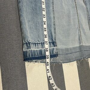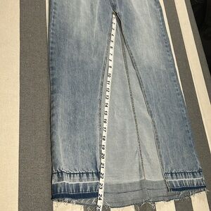 Mid-rise waist with a long column silhouette, ankle-grazing hem, and raw edge finish for a laid-back vintage vibe.