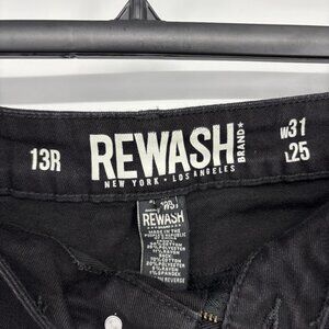 Complete with raw hems and a high waist, Rewash's straight-leg jeans are just what your wardrobe needs to stay in style. pprox. inseam: 24-1/2" High rise: approx. 10-1/2"; leg opening: approx. 14" Zipper and button closure at front; belt loops Destruction throughout; whiskered at hips; raw hem Front: cotton/polyester/rayon; back: cotton/polyester/rayon/spandex Machine washable Imported