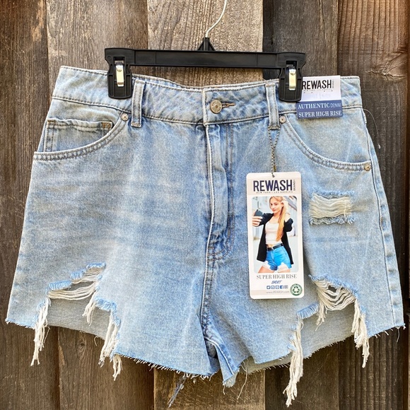 Light blue washed jean shorts. Frayed bottom with zipper and button.
