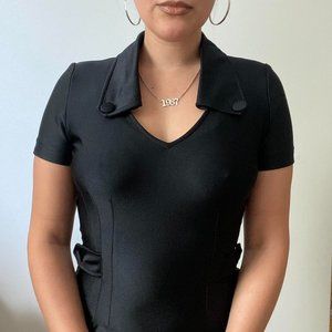 Rewi-M mini dress. This cutesy go-go dress features the cutest button collar, and shiny fabric. Very stretchy.