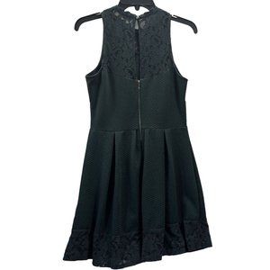 This Rewind Brand Lacey Back High Neck Sleeveless Dress is a stunning piece in a size M, dark green color. It's a mini style solid pattern dress made of polyester and spandex.