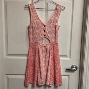 This dress is adorable! It is in good condition! Size small. It has buttons on the back and a small open circle on the back. It is the perfect summer dress!