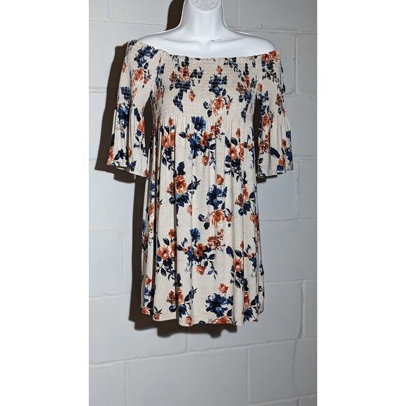 Boho chic off shoulder mini dress showcasing a beige backdrop adorned with a beautiful blue and orange floral print. Featuring a comfortable smocked bodice and short bell sleeves, this flowy dress offers a relaxed fit and an effortlessly stylish look. The off the shoulder design accentuates the neckline, while the floral pattern adds a touch of femininity.