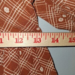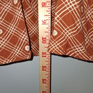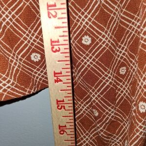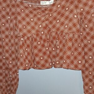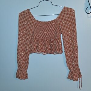 This long-sleeved cropped blouse features a charming copper and white checkered pattern with a bohemian, peasant-style aesthetic. It is characterized by its square neckline, ruched front, and flared ruffle cuffs one sleeve is missing tie