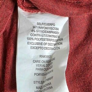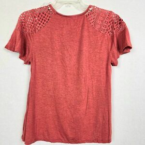 Soft red Rewind top with crochet lace shoulders and floral appliqué detail. Lightweight rayon-spandex body with comfortable stretch. Casual boho style that pairs well with jeans, shorts, or layered looks.