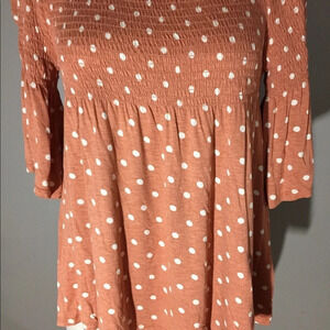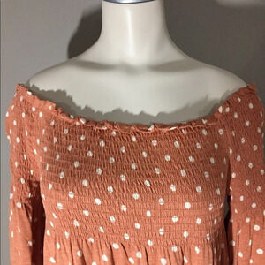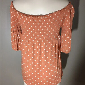NWOT Rewind brand smocked off the shoulder top in size M. Rust/burnt orange color with with polka dots. Please see photos for details. Item may show a difference in color based upon photography and perception. Photos are part of the description, as everyone’s level of condition may vary. From smoke free and pet free home. All packages are shipped the same or next business day.